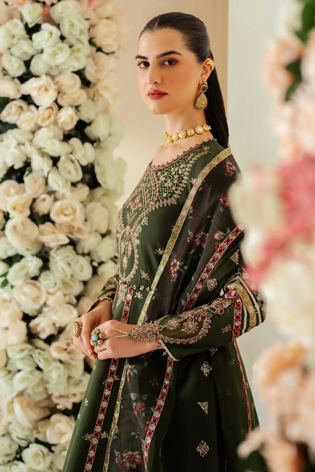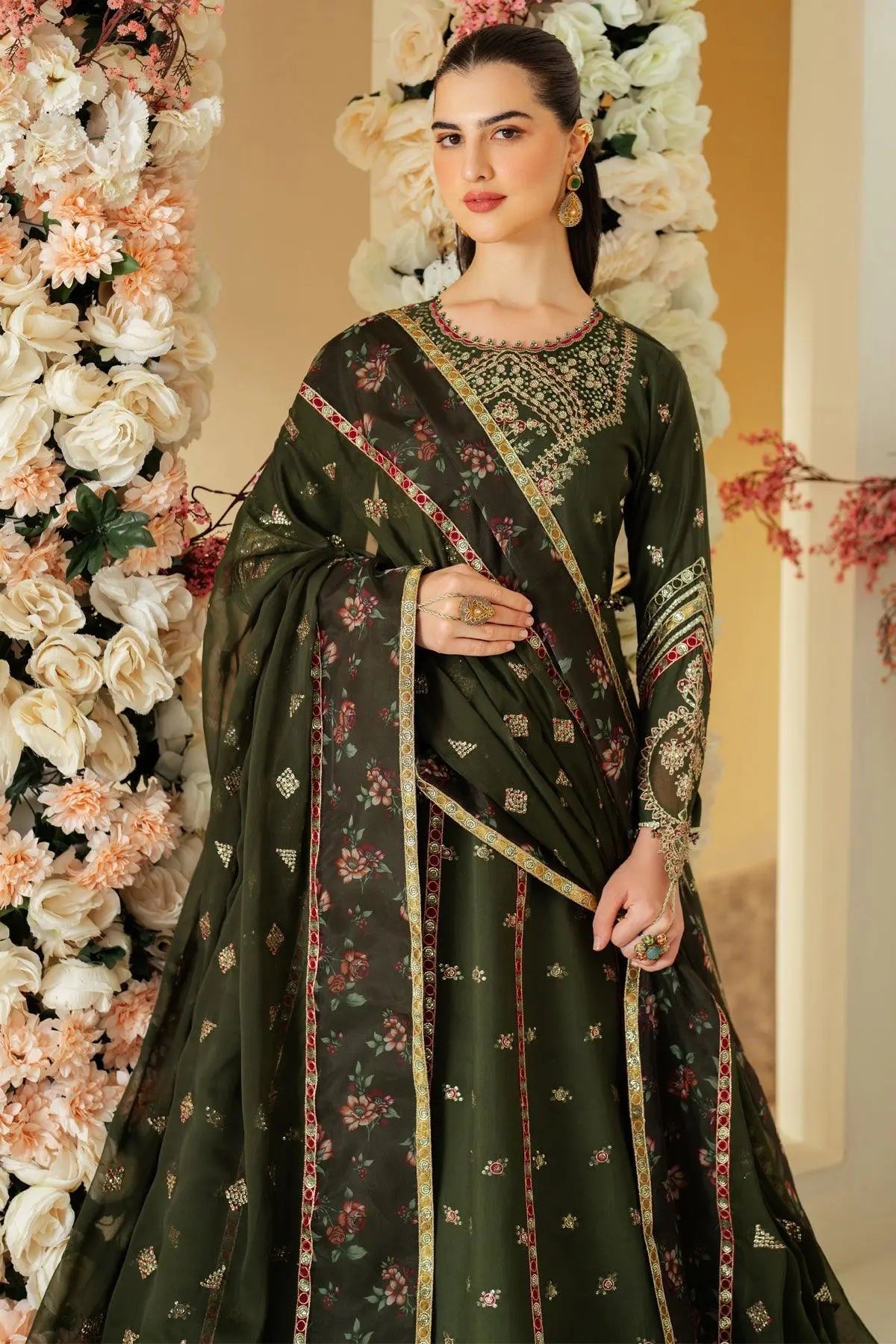 Pine is a breathtaking ensemble that showcases an olive organza dress with a fitted bodice. It features intricate embroidery that includes delicate sequins and multi-toned threadwork adding a luxurious touch to this beautifully crafted piece, paired with a printed chiffon dupatta and tonal raw silk trousers enhancing the overall elegance of the outfit.